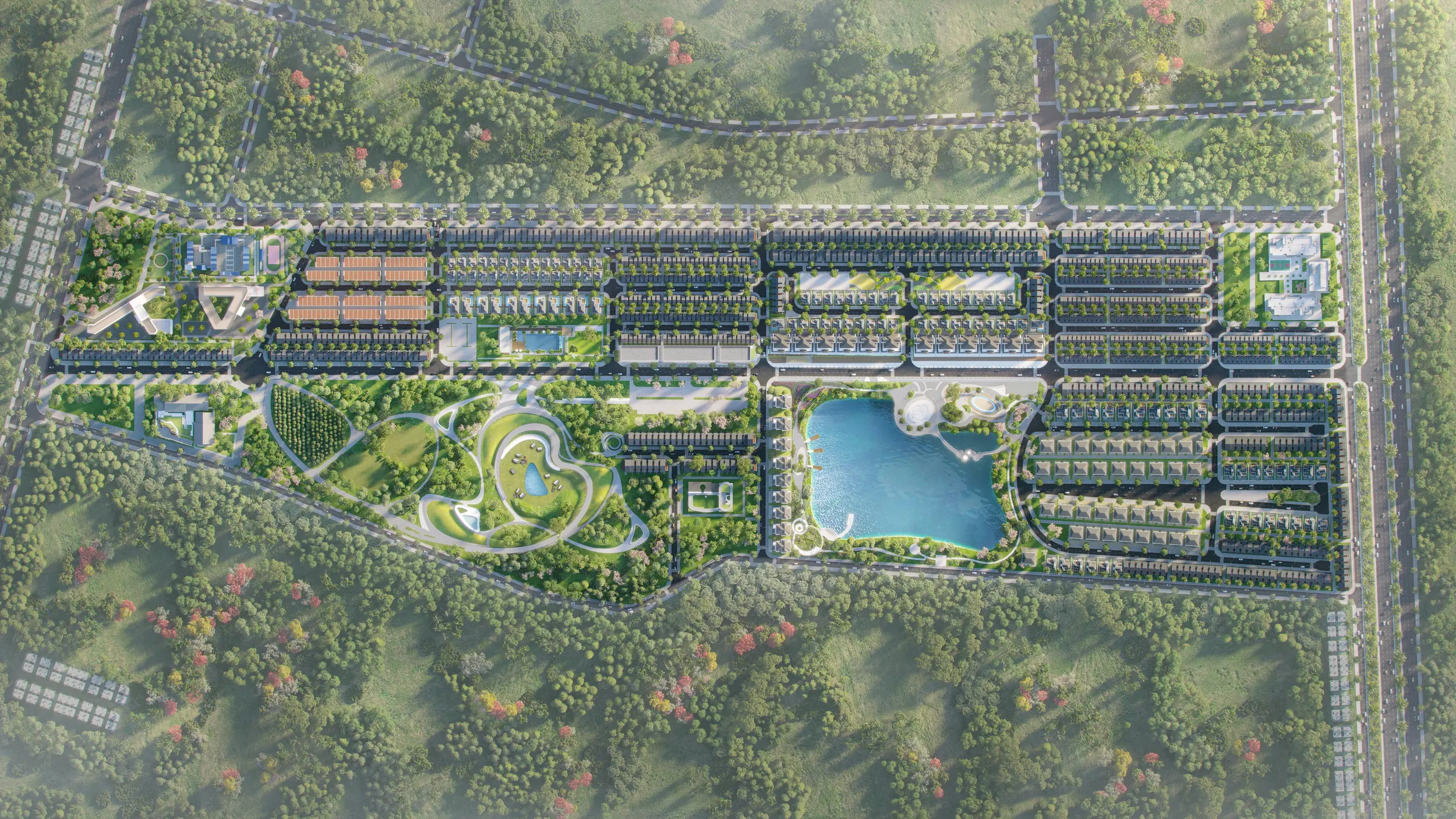 Trung tâm của dự án không phải là công trình, mà là cảnh quan. Một hồ nước lớn đóng vai trò như “trục tĩnh” của toàn khu — không chỉ là yếu tố thẩm mỹ mà còn là bộ điều hòa vi khí hậu, tạo nên lớp đệm sinh thái cho toàn bộ khu đô thị. Bao quanh đó là hệ thống công viên chuyên đề: vườn na, vườn sầu riêng, khu bảo tồn động vật sinh thái… Đây không đơn thuần là tiện ích, mà là một cách đưa sản xuất nông nghiệp và sinh thái vào trong cấu trúc đô thị, tái hiện lại hình ảnh Tây Ninh như một vùng đất nông nghiệp trù phú.