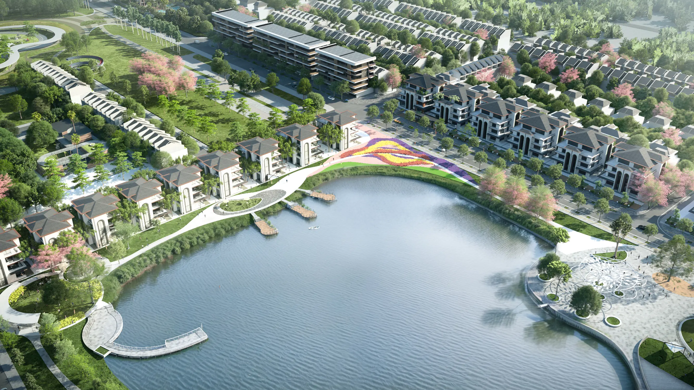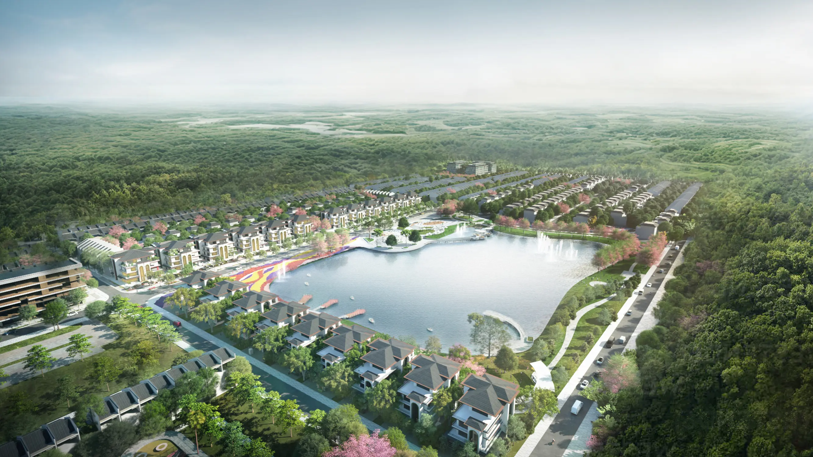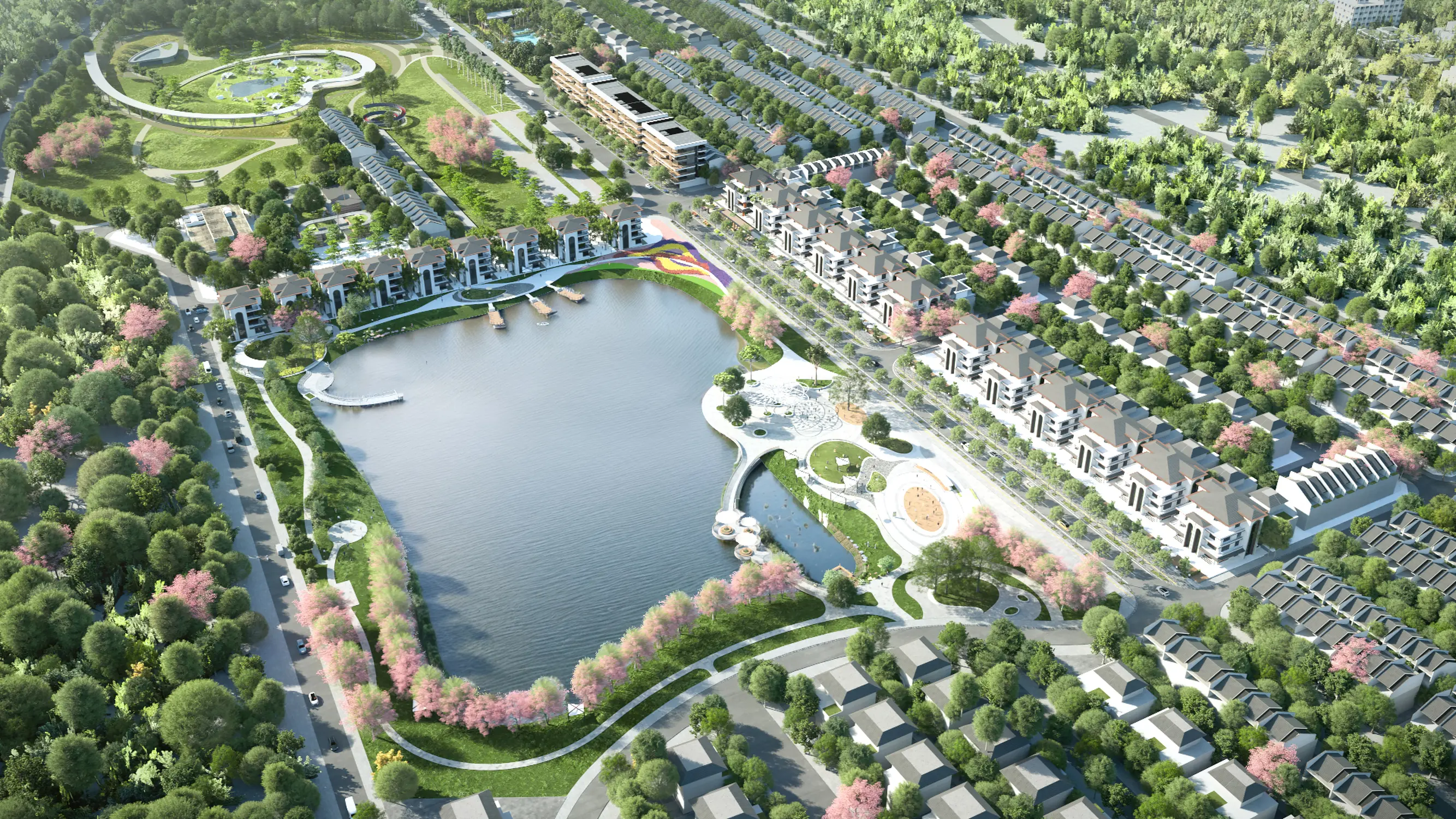 Việc tập trung này giúp tăng hiệu quả vận hành, đồng thời tạo nên các “điểm hút” rõ ràng trong không gian đô thị. Đây là mô hình “All-in-one” thường thấy trong các khu đô thị hiện đại, nơi cư dân có thể sống – làm việc – giải trí trong cùng một hệ sinh thái khép kín. Quan trọng hơn, hệ tiện ích này không phá vỡ cảnh quan, mà được “cài” vào trong lớp xanh, giữ cho tổng thể vẫn mang cảm giác trong lành, thư giãn — đúng với tinh thần một đô thị nghỉ dưỡng ngoại vi.