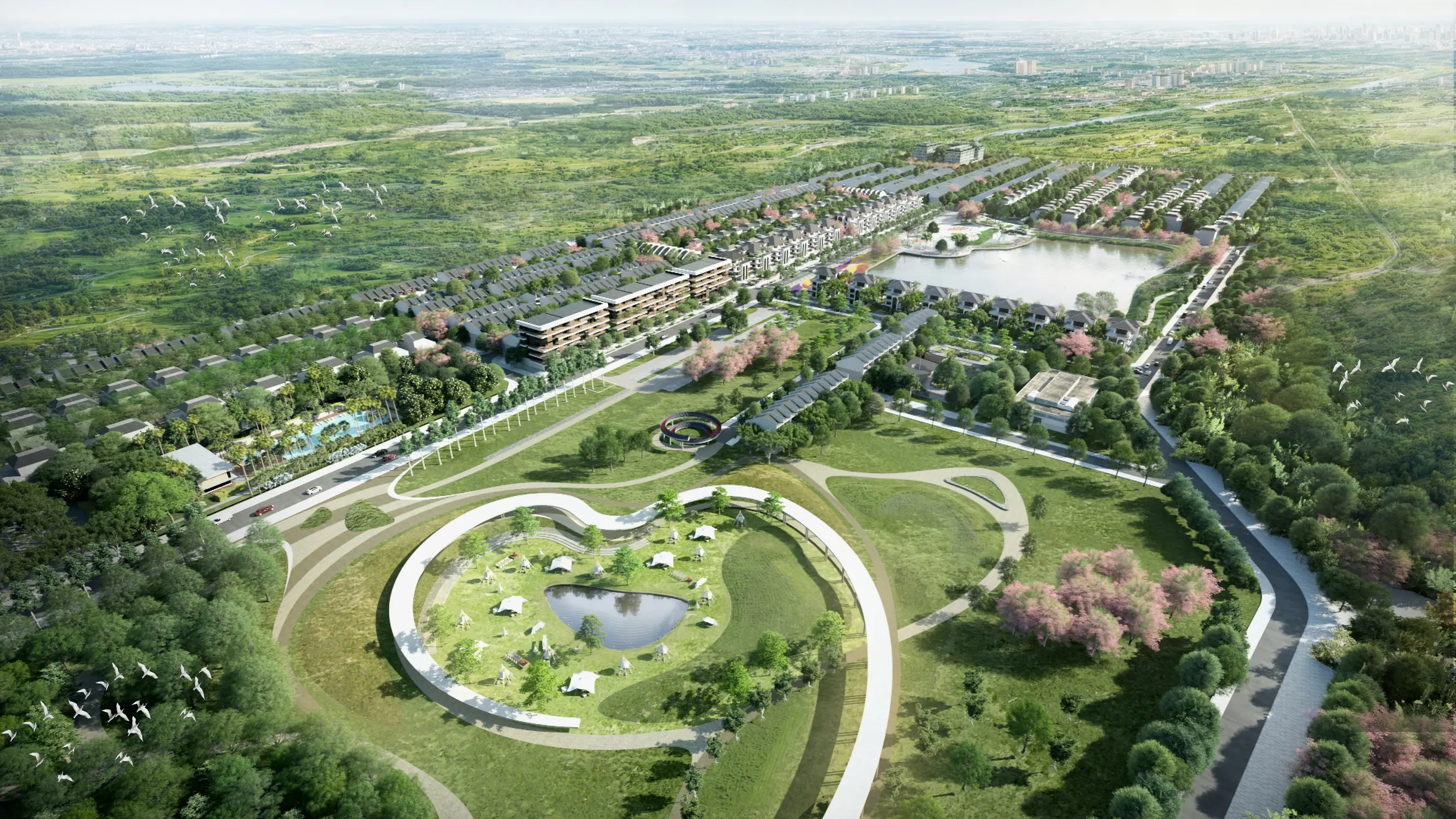 Trung tâm của dự án không phải là công trình, mà là cảnh quan. Một hồ nước lớn đóng vai trò như “trục tĩnh” của toàn khu — không chỉ là yếu tố thẩm mỹ mà còn là bộ điều hòa vi khí hậu, tạo nên lớp đệm sinh thái cho toàn bộ khu đô thị. Bao quanh đó là hệ thống công viên chuyên đề: vườn na, vườn sầu riêng, khu bảo tồn động vật sinh thái… Đây không đơn thuần là tiện ích, mà là một cách đưa sản xuất nông nghiệp và sinh thái vào trong cấu trúc đô thị, tái hiện lại hình ảnh Tây Ninh như một vùng đất nông nghiệp trù phú.